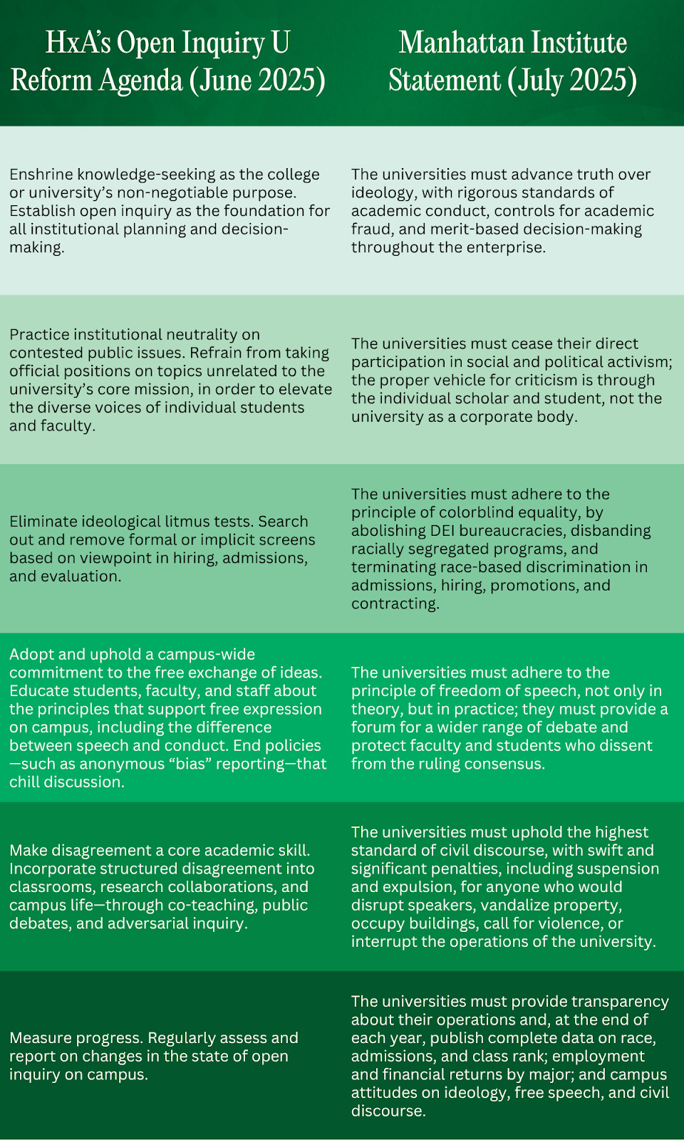 The Manhattan Institute statement’s recommendations for university reform are not novel; in fact, they are similar to a number of the reforms HxA recommended last month in our Open Inquiry U Reform Agenda.